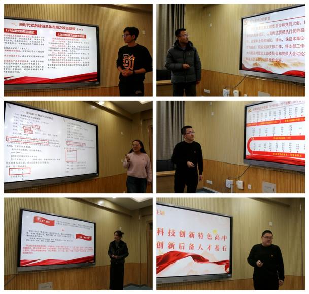 学校各党支部书记、委员代表聚焦“四强”党支部建设,分五个专题讲授了专题微党课。一是围绕党支部的基本任务、工作机制,明确新时代党的建设总体布局,加强支部政治建设、思想建设、组织建设、作风建设、纪律建设;二是明确党支部书记、支部委员的职责,加强支部“三会一课”和主题党日工作;三是做好支部组织生活会、谈心谈话、民主评议党员工作,规范支部会议记录;四是完善发展党员的五个阶段、25个流程提高发展党员工作质效;五是支部“党建 ”特色品牌创建情况。行政党支部书记和第三党支部书记分享了创建支部“党建 六育融合”特色品牌和“打造科技创新特色高中 奠定拔尖创新人才培养基石”特色品牌的经验困惑与思考。校党委委员分别对六位同志的专题微党课进行了点评。