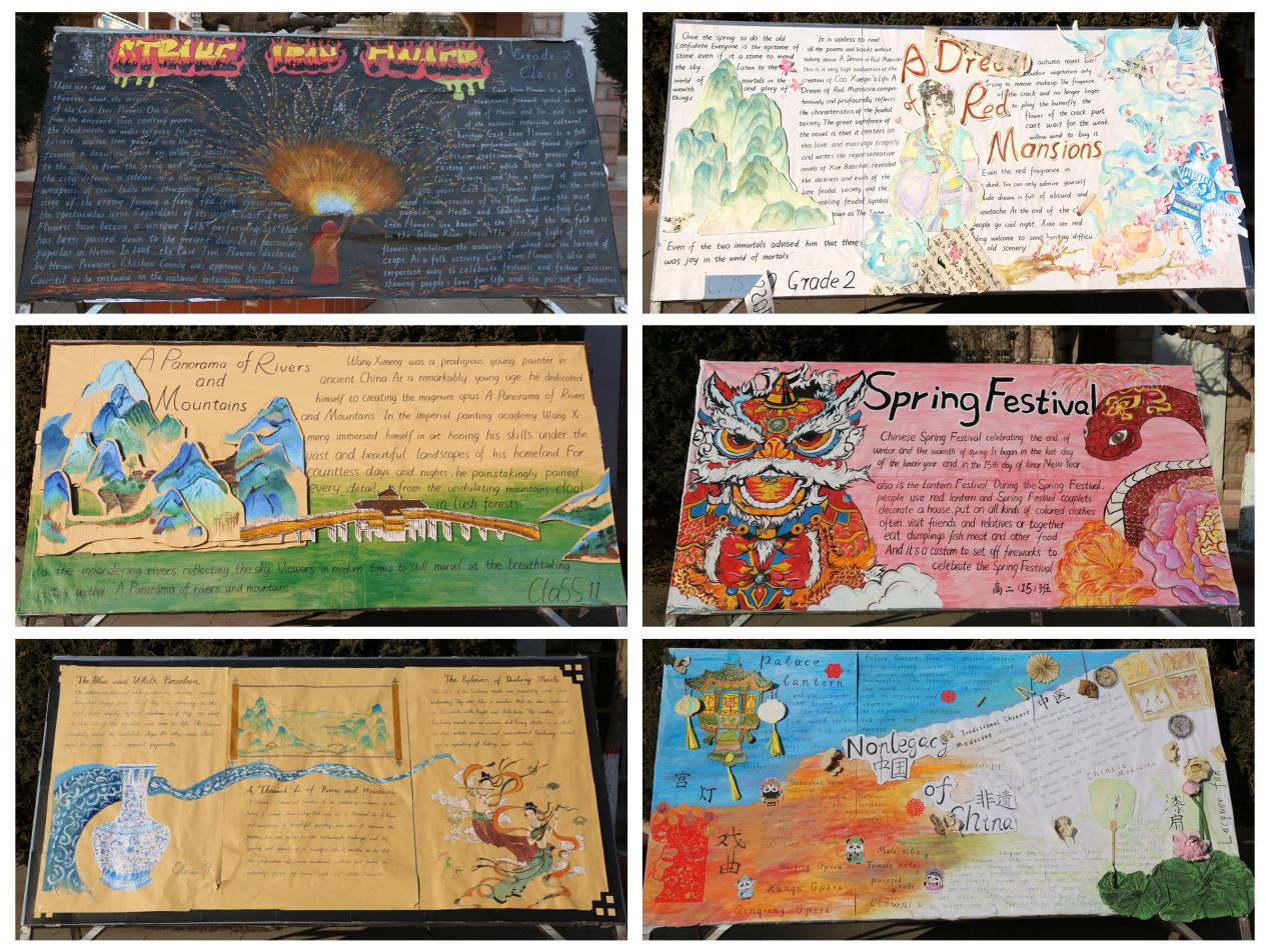 高二年级各班的英语板报于校园广场惊艳亮相。板报以“用英语讲中国故事”为主题,其形式多样、内容丰富,从古朴典雅的书法字体到绚丽多彩的插画装饰,从简洁大气的排版布局到独具匠心的创意设计,每一块板报都形式各异,尽显同学们的才华与巧思。丰富的色彩与创新的元素相互交融,在萧索的冬日里熠熠生辉,吸引着过往师生纷纷驻足,更为校园增添了一抹温暖而亮丽的文化色彩。