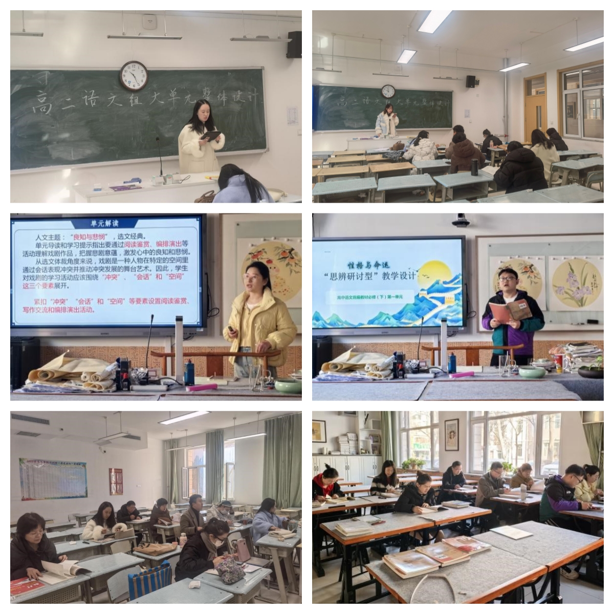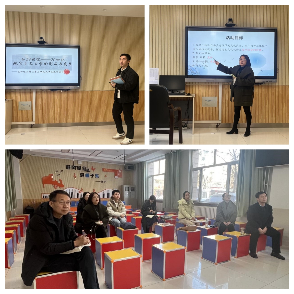 语文组:高一年级纪雨田、马红霞两位老师分别展示了必修下册第一、二单元的教学设计,为新学期教师教学提供了重要范式。两位教师的教学设计集中体现了大单元教学的先进理念。纪雨田老师单元设计结构化思维突出,通过主题统整实现单篇到群文的有机衔接。马红霞老师以项目式学习重构戏剧单元,通过真实艺术实践活化文本。此外,两位老师的设计中都有着鲜明的文化传承意识,在语言建构中厚植文化自信;均展现出了精准的课标解读能力、创新的课程开发意识和以生为本的教学智慧。高二年级夏彤、孙甜甜两位主讲教师的深度解析与集体研讨,构建起"思辨理性与革命精神双轨并进"的教学体系,为提升学生核心素养探索新路径。高三年级马绍福老师展示了选择性必修上册第三单元大单元教学设计,以“现实主义文学发展”为中心,梳理现实主义文学从19世纪到20世纪经历了多个阶段的发展。现实主义文学通过对社会现实的深刻描写和批判,展现了人类在不同历史时期的精神追求和社会变迁,具有重要的文学和历史价值。