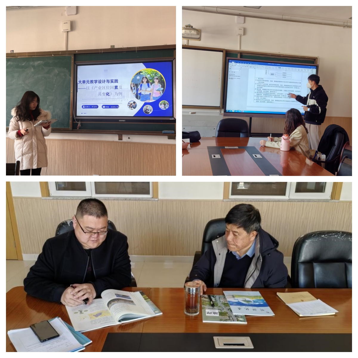 地理组:高一地理组的折宝仪老师以《乡村和城镇:空间、进程与文化》和《产业区位因素及其变化》为例,进行了大单元教学的设计与实践案例分享。折老师巧妙地打破课时限制,以真实情境和复杂问题为驱动,引导学生分析综合地理要素间的关联性,能有效提升学生的综合思维、区域认知等学科核心素养。潘雄武校长也就上学期的期末考试情况做出了评价,提出青年教师要认真学习《高中地理学业水平质量标准》,精准把握命题导向和难度,提升个人的选题、筛题、改题能力,从而深化对学科知识体系的整体把握。高二地理备课组长魏鹏,针对《资源、环境与区域发展单元》展开全面且细致的单元教学规划介绍。他以扎实的专业知识和丰富的教学经验,从课程目标、教学重难点到教学方法的选用,进行了系统梳理,为后续教学活动提供了清晰的方向指引。高三地理组康卉君老师首先以“城市、产业和区域发展”为大概念进行单元整体设计,主要教学设计思路为:解读课程标准、提炼核心概念、分层教学目标、创设真实情境、开展教学活动、综合单元训练,并以上海市为例介绍地区产业结构及其变化的具体课时教学设计。赵阳老师以“自然地理环境的整体性和差异性”为主题进行单元教学设计,明确了单元架构、单元目标、课标内涵,并具体以阿拉斯加东南部温带雨林为情境,以森林、鲑鱼、棕熊、座头鲸、人类等要素为线索,进行问题式教学设计展示。