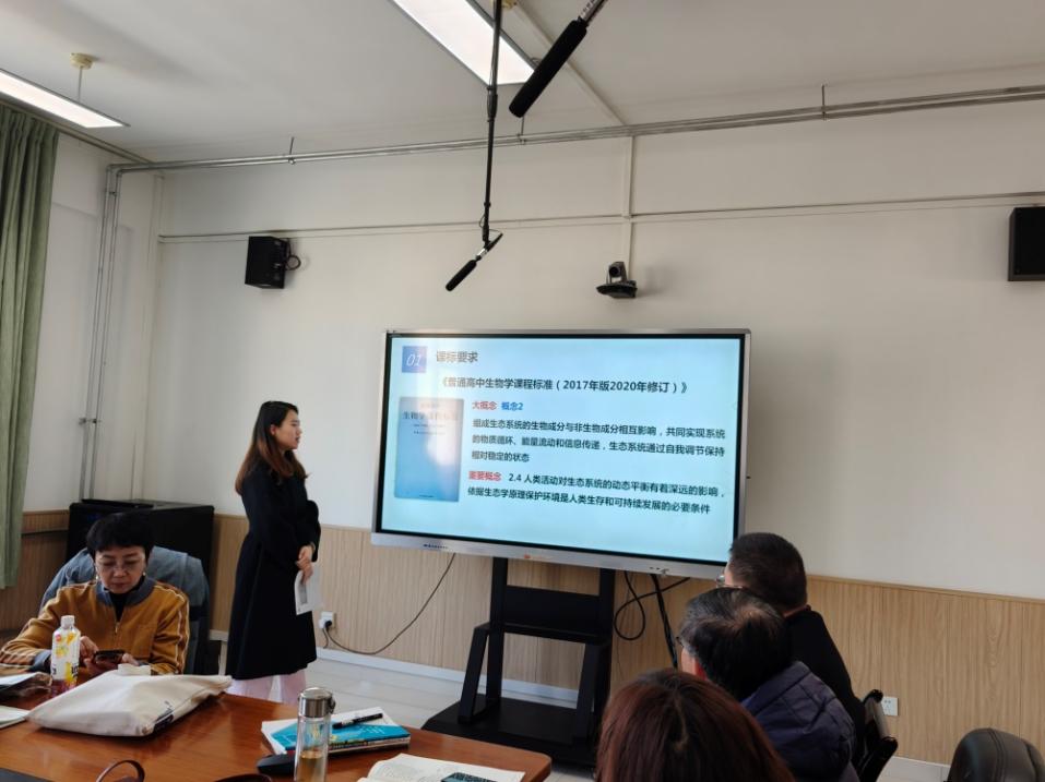 在教学实践创新环节,金晶老师展示了生物选择性必修二"人与环境"大单元的教学设计,充分体现了跨学科教学的创新思路。该教学设计以"生态系统与可持续发展"为主题,引导学生逐步构建生态系统的认知框架。