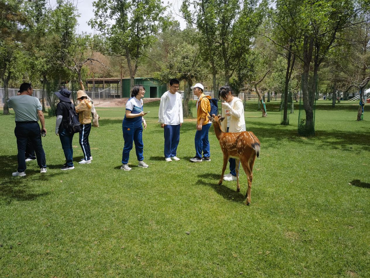 午后的青绿时光鹿营园研学环节,同学们聚焦"生态治理 产业发展"的创新模式。在林下养殖区,成群的梅花鹿在绿地上穿梭,工作人员介绍道:"这些沙生植物既是固沙先锋,又是养殖饲料,通过'林-牧-游'融合发展,治沙成果正转化为乡村振兴的经济动能。"同学们实地考察生态旅游与沙产业结合的运营模式,从旅游地理视角分析客源市场与产业辐射效应,将课本中的"可持续发展"理论具象为眼前的"绿富同兴"实践。