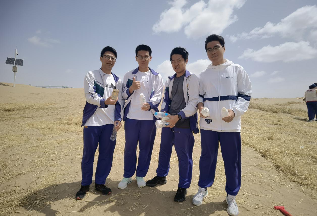 在草方格治沙实践区,专业技术人员演示了麦草方格的扎设工艺:将废弃麦草呈方格状嵌入沙地,形成1米×1米的防风固沙单元。"草方格不仅能降低风速,还能截留雨水促进沙生植物生长。"随着工作人员的讲解,同学们分组体验扎设操作,当亲手将麦草压入沙地时,真切感受到"草方格沙障"这一"最经济实用治沙技术"背后的智慧与汗水。高二(16)班学生王同学在研学单上写道:"指尖触到沙粒的灼热,才明白治沙英雄们用数十年光阴书写的'人进沙退'有多不易。"让人感动的是,在沙漠徒步穿行过程中,所有同学自觉地将沙漠里边遗弃的塑料瓶等垃圾全部捡起,带出保护区核心区。