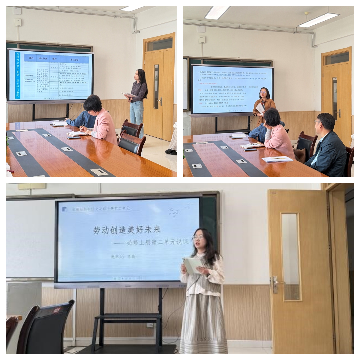 语文组三位不同年级的老师立足本年级课本内容进行了说课分享。高一年级李淼老师聚焦 “劳动创造美好未来”,紧扣必修上册第二单元,剖析教材,分析学情,构建多元教学目标,教学过程亮点频出。高二年级张丹老师围绕 “理论的价值”,解读选择性必修中册第一单元,分析学情后,进行了有亮点的教学规划。高三年级马荣老师以 “探索文学创造奥秘” 为主题,阐释创造核心要义,将理论与诗歌创作结合,教学方法大胆创新。三位老师的说课从不同维度诠释了语文教学魅力,为语文教学提供了思路与借鉴。