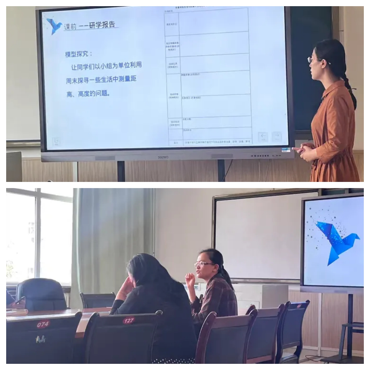 数学组尹雪燕老师分享《余弦定理、正弦定理应用举例》课例。她以“数学是解开世界奥秘的钥匙” 为理念,为解决学生学定理不会用的问题,将数学建模搬入课堂:课前安排小组测量任务,课中播放 nasa 视频并让学生展示报告,追问核心问题,结尾五问串起学科本质,课后留测算地月距离挑战题。尹老师的分享让老师们深受启发,张德萍副校长强调思维型课堂教学通过情境激发、自主探索、合作交流、知识迁移、反馈评价与反思感悟环节的有机融合,构建一个充满活力与深度的课堂,是培养学生高阶思维能力与学科素养的基本流程,也是实现知识传授与思维培养的有机统一。