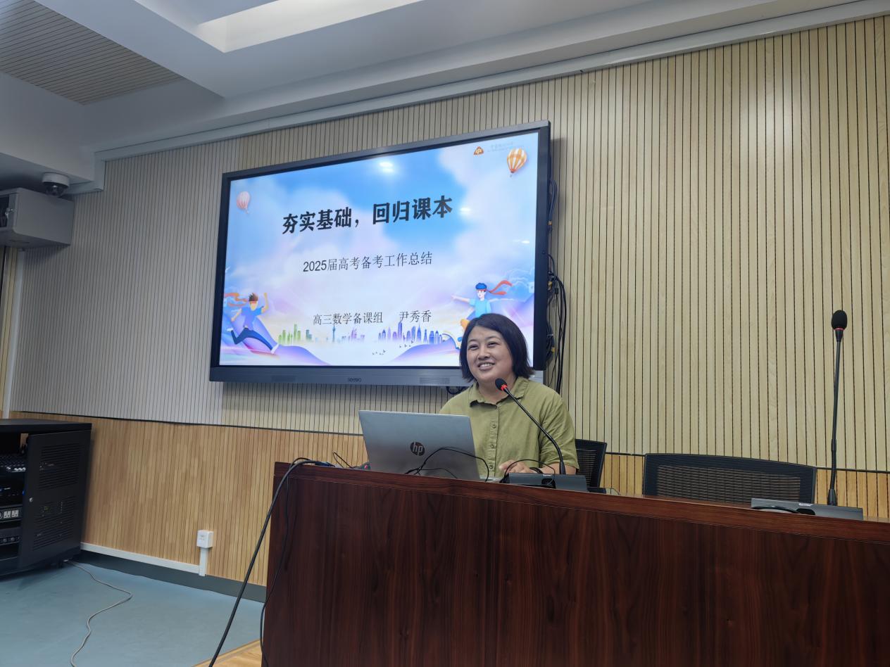 数学组2025届高三备课组长尹秀香老师分享备考经验:2025 高考数学卷基础更实、情境更活、结构更新,“素养导向,思维为本”。备考采用三阶法,一轮深耕课本,用 “大概念” 串联知识;二轮实施周四检测前置等;三轮模拟实战补漏洞。马慧老师分享阅卷发现:命题深化基础考查,强化思维品质等。典型失分点集中在立体几何、导数应用等题型,因概念不清、计算差等导致。建议抓基础、重规范、破难点、联实际。会议强调 2026 备考需紧扣课标,回归课本,培育思维,助力学生成长。