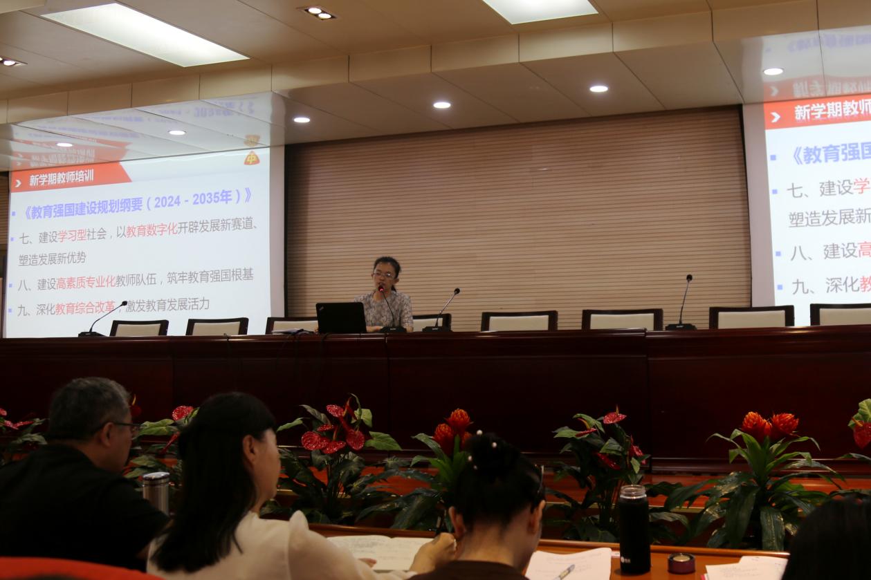 张德萍副校长结合教科研工作开展了新学期教职工培训。要求全体教职工要全面贯彻党的教育方针、落实立德树人根本任务和《教育强国建设规划纲要(2024—2035年)》,深化育人导向、强化价值引领;聚焦内容设计、践行“三新”理念;规范设计过程、确保质量闭环;展现教学个性、鼓励智慧创造。