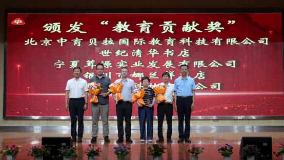 笃行育人传薪火,矢志奉献铸教魂。余维学书记和张永宏校长为北京中育贝拉国际教育科技有限公司吴森文、世纪清华书店杜梦婷、宁夏茸源实业发展有限公司李成龙、银川市娜兰鲜花店邓兰、宁夏豪聆科技有限公司杨兴昌等热忱支持教育事业的社会各界友好人士颁发了“教育贡献奖”。