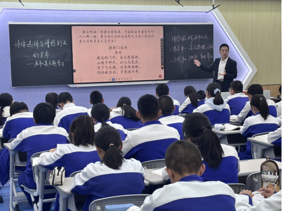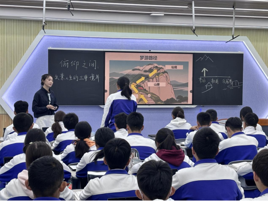 张雪老师的课堂聚焦“失意人生的三重境界”,以细腻视角串联三首唐诗:借弗洛伊德《梦的解析》带学生“仰视天姥”,寻李白梦中的精神狂欢;立足安史之乱背景,伴“万里悲秋”诗句让学生“俯视人间”,品杜甫忧国忧民的圣者仁心;通过“人物小传对读”活动,引导学生“平视知己”,悟白居易与琵琶女的真切共鸣。整堂课以情感为线,让学生在诗意中学会以精神境界超越现实困顿,尽显语文教学的人文温度。