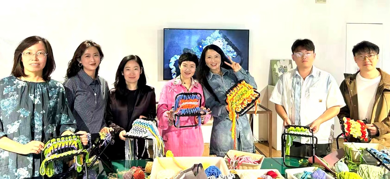 教研活动首站,教师们沉浸于“纤维与脉络”主题展览中,从一幅幅、一件件精湛的艺术作品中汲取创作养分与教学灵感。活动核心环节——“指尖穿梭,编织匠心”艺术小马扎创作实践,在专业导师指引下,教师们化身为专注的创造者,以经纬为语言,与色彩对话,将个人的美学思考与对材质的理解,一一线织于马扎方寸之间,既让老师们体验了从灵感到实物的完整创作过程,又深刻感悟到艺术与生活交融的本真魅力,为教学实践注入了源头活水。
