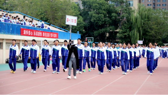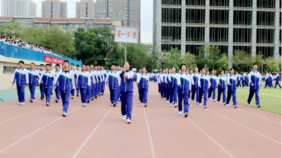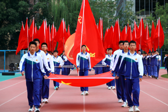 红旗猎猎、迎风招展,红旗方队高擎国旗、校旗、校徽率先入场,高一全体同学、高二运动员方队踏着正步,有序依次入场。同学们步伐铿锵、口号嘹亮、精神抖擞、意气风发,展示着一中学子青春昂扬的良好风貌。