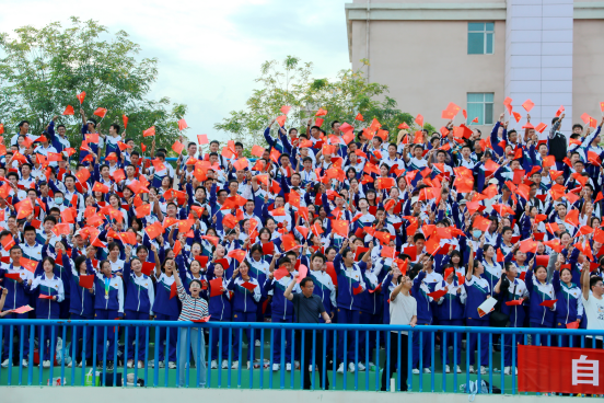 田径场上各方队整齐肃立,伴随着庄严的国歌声,五星红旗在和煦的晨光中冉冉升起。