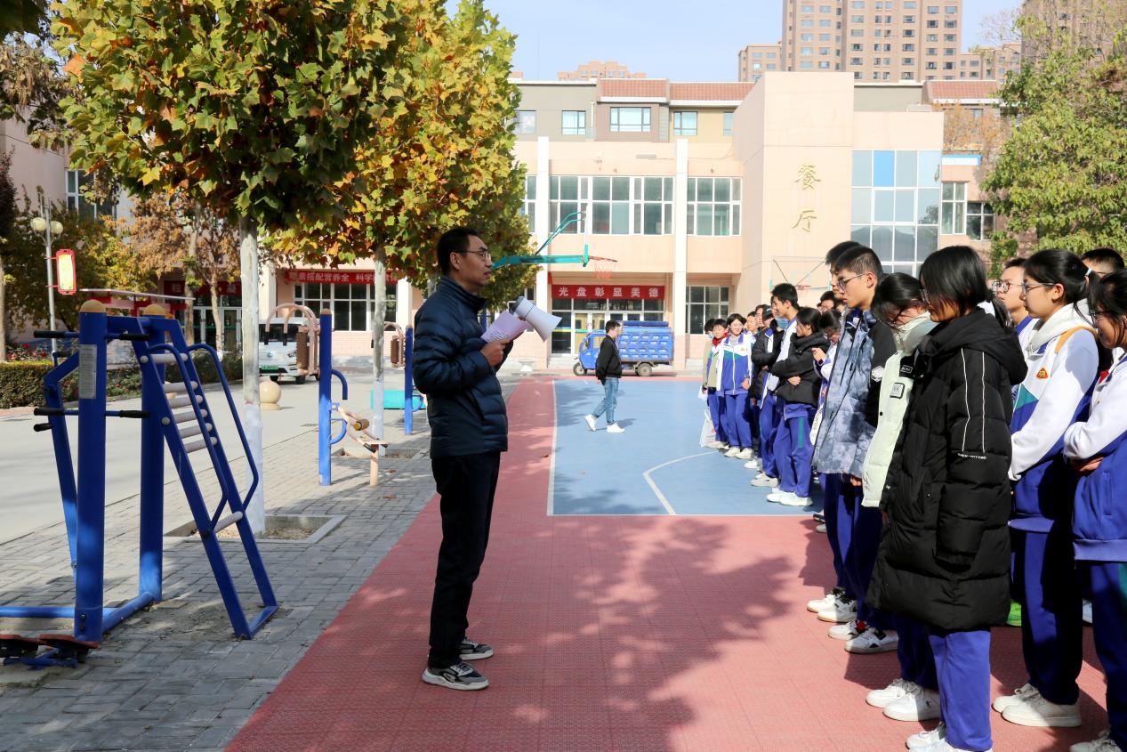 全体人员撤离公寓楼后,学生们按年级、班级在篮球场整齐列队。张金荣副校长对本次疏散演练的整体情况进行总结点评。