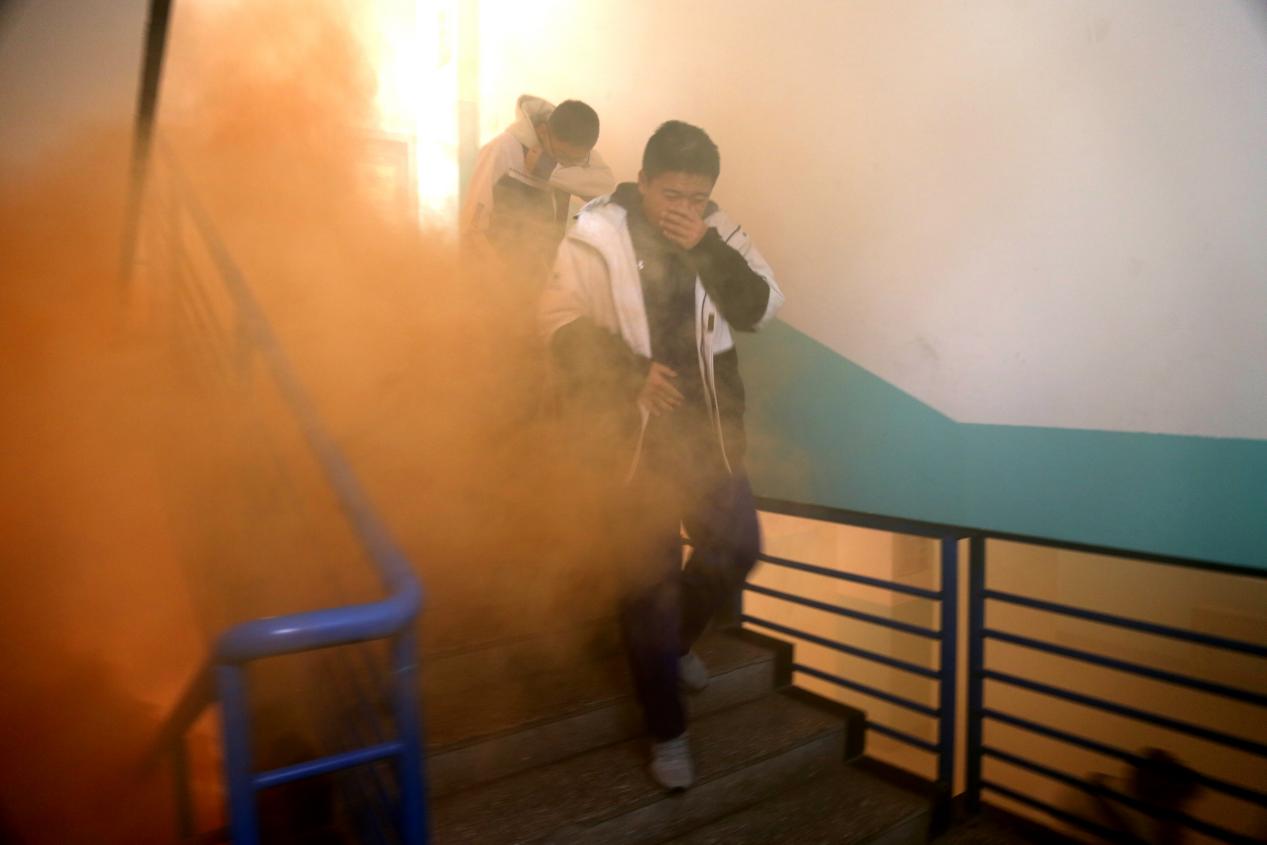 模拟火情发生后,学生公寓楼内立即响起疏散警报。各楼层疏散指挥员迅速到位,引导学生分别从东西两侧安全通道,快速有序地撤离至校园篮球场指定区域。疏散途中,住宿学生严格遵循“捂口鼻、低弯腰”的规范动作,全程不慌乱、不抢道、不拥挤;参与演练的教职工各司其职、指挥到位;校医团队全程待命,随时提供应急医疗保障。