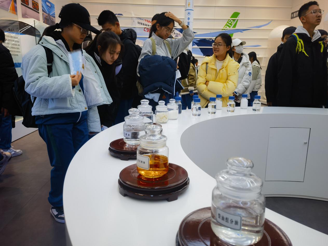 首站展厅内,巨大的沙盘模型清晰呈现出基地 3484 平方公里的规划版图,蓝色线条勾勒出煤炭、电力、化工产业链的关联脉络。讲解员指着 “地下采煤模型”,演示智能化采煤设备如何在千米井下作业,展台上由煤裂解合成的汽车配件、火箭高铁材料、化妆品和服装类产品让同学们惊叹煤化工产品已经进入生活的每个角落。屏幕上滚动播放着 2016 年习近平总书记视察时 “社会主义是干出来的” 的嘱托,让我们对 “实干” 二字有了更具体的感知。琳琅满目的煤制油产品,从透明的石脑油到淡黄色的柴油,搭配着煤炭裂解成化工原料的流程图,化学课本上的原理瞬间变得鲜活。
