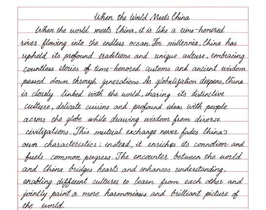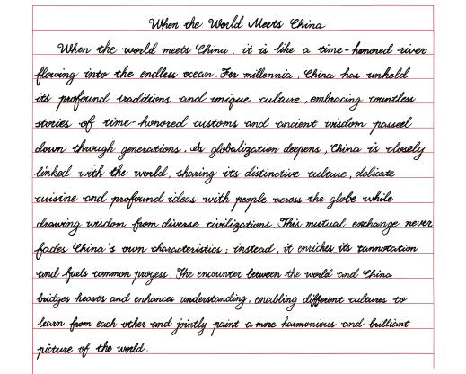 本次英语书法比赛以 “when the world meets china” 为主题,高二年级全体学生踊跃参与。参赛作品字母书写标准、排版工整、笔画流畅、结构匀称,将英语书写的韵律与美感完美融合。同学们既展现了扎实的书写功底,也深化了对比赛主题的理解与表达。此次活动以赛促学,有效强化了学生对规范书写的重视,为校园文化建设添上了亮丽的一笔。