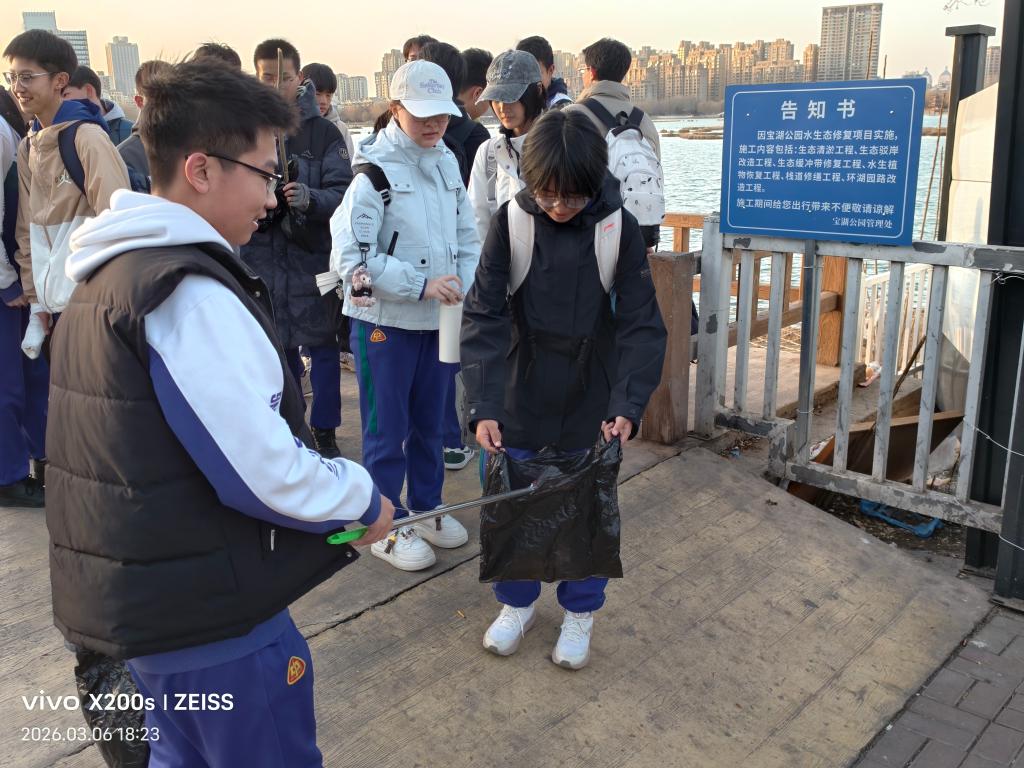 到达宝湖湿地公园后,杨瑞老师向同学们强调了活动纪律与安全注意事项,并对清洁区域进行了细致划分。同学们迅速分组,手持夹子、垃圾袋等工具,对公园内的烟头、塑料袋、塑料瓶、纸屑等垃圾进行全面清理。大家分工协作、干劲十足,不放过任何一个卫生死角,用双手为保护湿地公园的生态环境贡献力量,以实际行动践行“黄河湿地生态环境保护,从我做起”的理念。